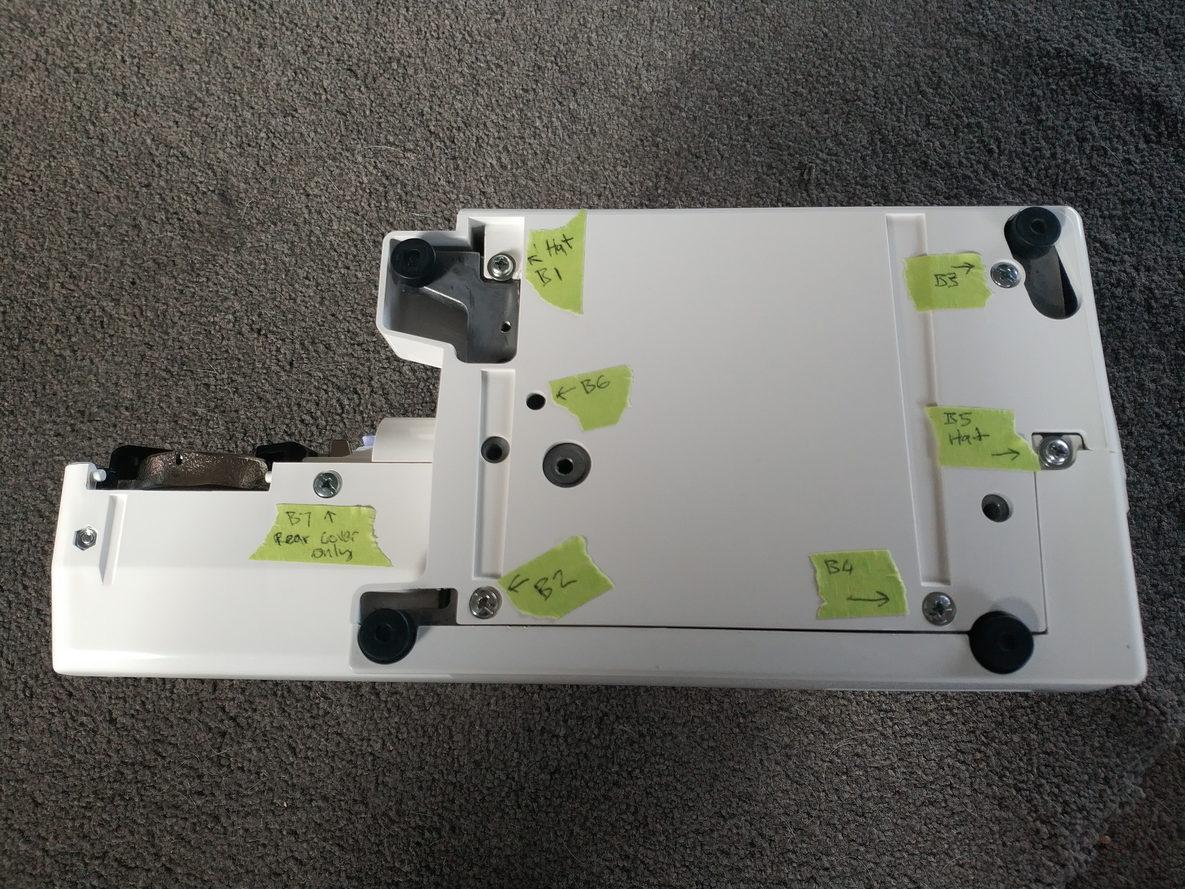 | B5 | Bottom side, middle right | Hat | Front panel removal | |
